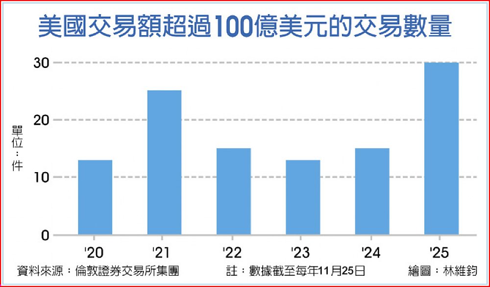 川普入主白宮後鬆綁監管,主管機關放寬反壟斷執法,提升企業進行大型併購交易的意願和信心。統計數據顯示,今年來規模超過百億美元的併購案數量,較去年同期翻揚一倍。