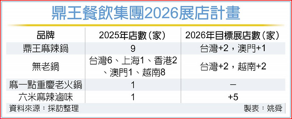 鼎王集團旗下有鼎王麻辣鍋、無老鍋、麻一點重慶老火鍋、六米麻辣滷味等四大品牌,總店數29店,2026年集團目標展店數12家。看好港澳、越南、東南亞市場對台灣火鍋接受度提高,鼎王集團2026年將加大海外展店力道,澳門新增1家鼎王、越南2家無老鍋。