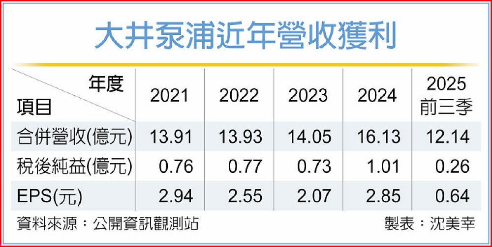 法人依據大井泵浦前十月營收13.32億元推估,今年營收上看16億元,與去年持平,明年營收有望挑戰20億元,創歷史新高。
