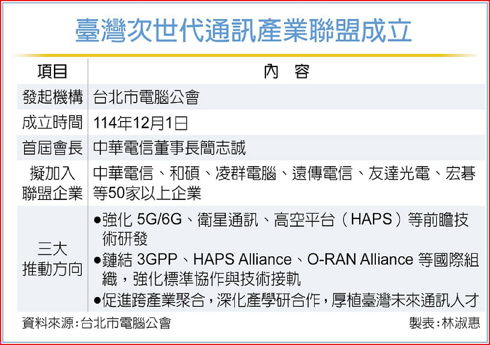 發起「次世代通訊產業聯盟」成立的台北市電腦公會表示,6G、低軌衛星、非地面網路(NTN)等新興通訊技術正加速發展中,TNGCA將集結地面設備、衛星服務、衛星本體、HAPS及行動通訊等領域的核心業者,發展次世代通訊、實現網路韌性,全面啟動我國次世代通訊產業升級,提升台灣通訊產業在全球市場之競爭力與影響力。