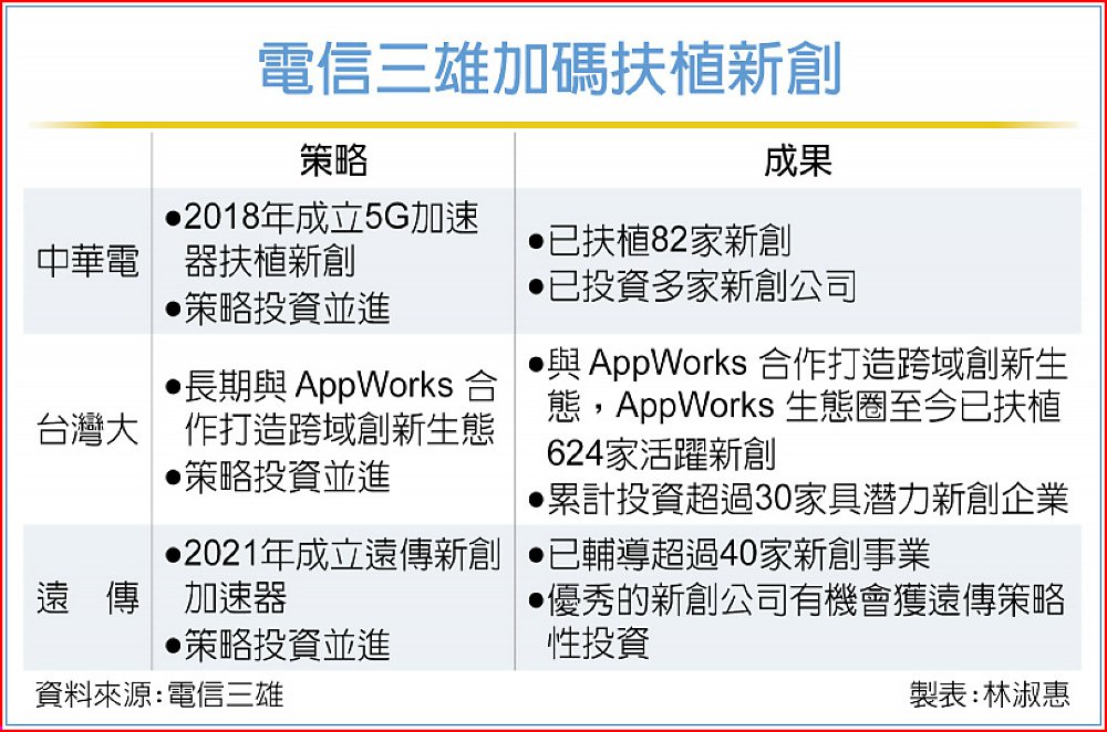 電信三雄透過投資、成立加速器,加碼扶植新創!其中,中華電信加速器已扶植82家新創,並投資多家新創公司。台灣大長期與AppWorks合作打造跨域創新生態,AppWorks生態圈至今已扶植624家活躍新創、累計投資超過30家具潛力新創企業。遠傳電信已輔導超過40家新創事業,與新創合作共創商機逾2.3億元。