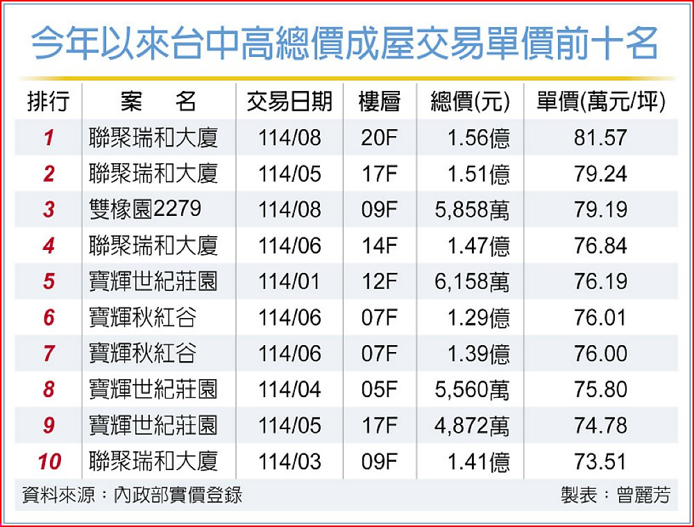 觀察今年來中台灣高總價成屋交易單價排行榜,前十名多由七期豪宅包辦,其中「聯聚瑞和大廈」包辦冠、亞軍,20樓毛胚屋8月以總價1.56億元、每坪單價81.57萬成交居冠、17樓毛胚屋5月以1.51億元、每坪單價79.24萬元成交居次。
