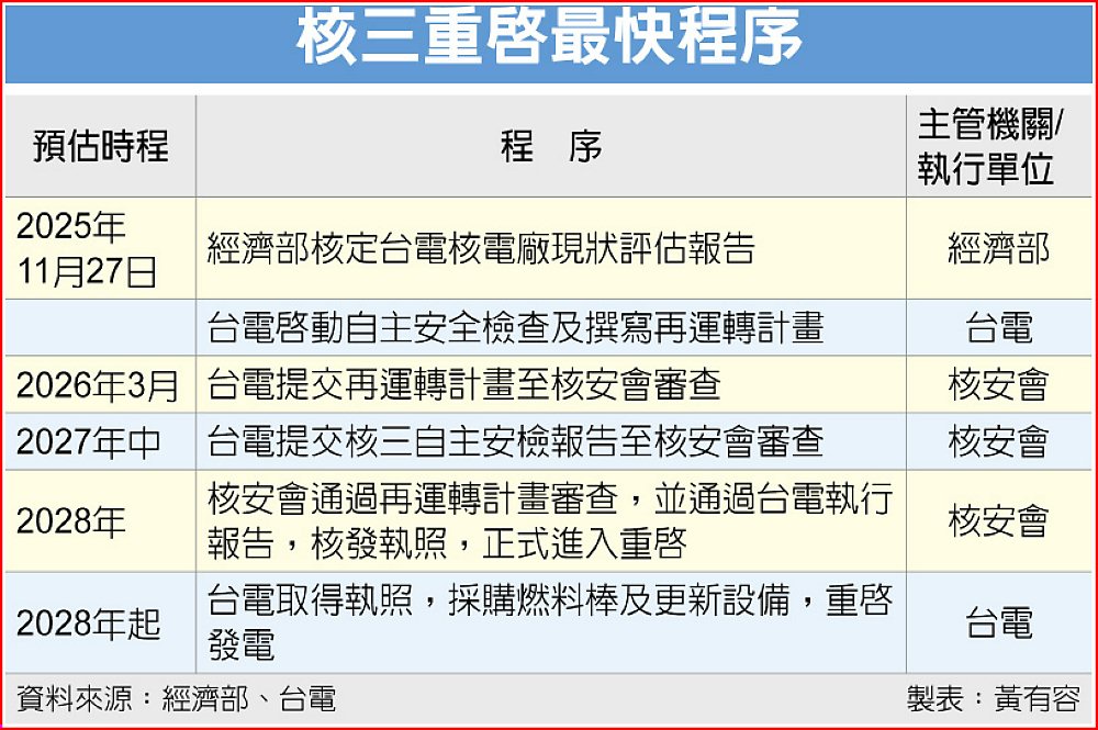 經濟部核定台電對核二、核三廠進行自主安全檢查後,各界關心最快何時重啟核能。經濟部長龔明鑫1日指出,若所有程序都以最快、最順利方式進行,核三廠2028年初就可通過核安會審查、啟動重啟程序。
