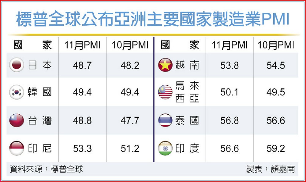 至於台灣製造業活動持續下滑,但下降的速度放慢。11月製造業PMI由10月的47.7上升至48.8,創下六個月新高紀錄,但仍未達50,連九個月陷入緊縮。標普全球市場情報分析師費迪斯指出,情勢出現穩定跡象,台灣的製造業PMI持續向50前進,顯示製造業度過大部分的困難時期。