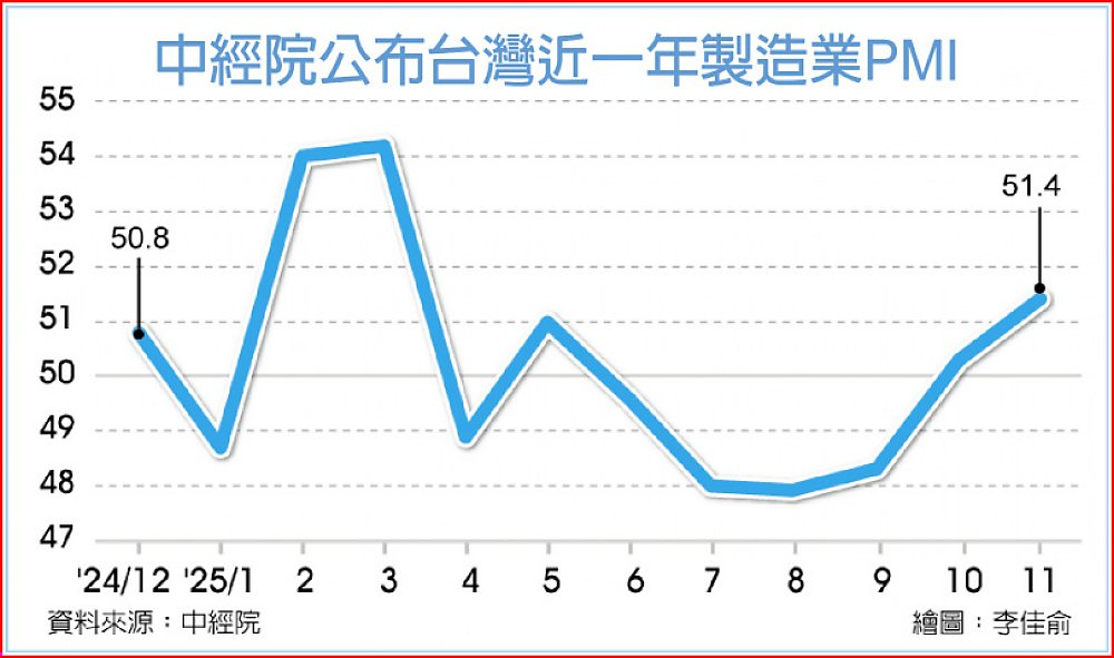 與此同時,根據中經院公布台灣11月製造業採購經理人指數(PMI),則攀升1.1至51.4,連兩月擴張並穩站榮枯值以上。中經院院長連賢明說,景氣有回穩之勢,帶動廠商對未來六個月展望,持續回升至4月美國宣布對等關稅以來最慢的緊縮速度,「不是非常樂觀,但廠商已經不那麼悲觀」。他表示,台灣對美順差有95%來自資通訊產品,對等關稅影響最大的卻是傳產業,如可以談到15%且不疊加,才能讓傳產業和日韓至少站在同等的競爭地位。