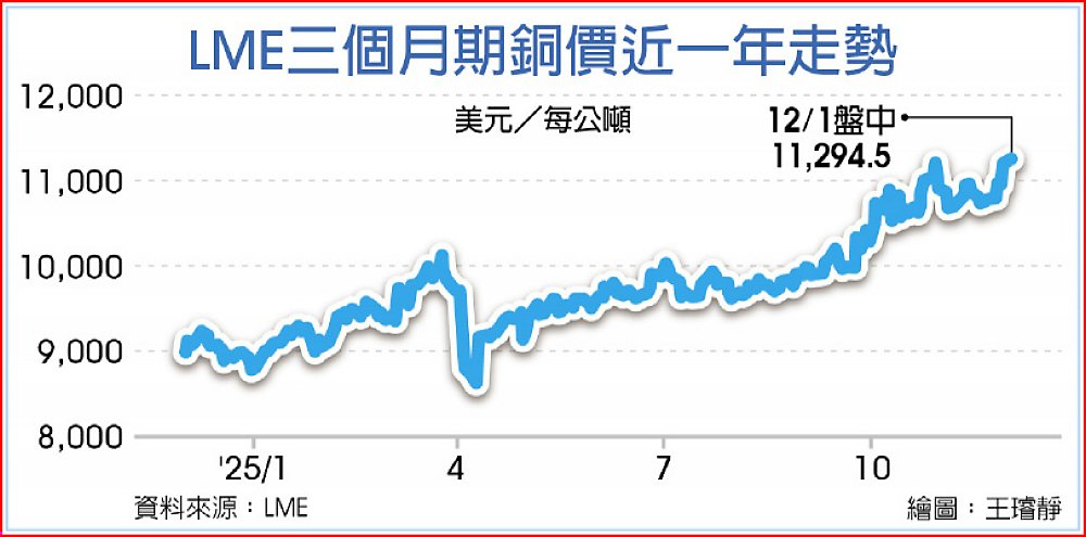 倫敦金屬交易所(LME)三個月期銅價,1日盤中每公噸上漲1%報11,294.5美元。累計年初迄今已累漲近29%。至於紐約銅價1日也跟進走揚,價格攀升至7月30日以來最高。銅價今年以來漲勢不墜,反映銅礦因各種意外停工導致供應出現中斷,以及煉銅業在年度銅礦砂供應談判中難跟礦商達成協議。在年度溢價飆升下,摩科瑞(Mercuria)能源集團警告明年供應短缺恐將更為嚴重。