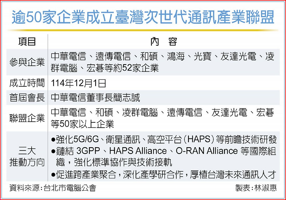 在全球6G、低軌衛星與非地面通訊(NTN)快速崛起的歷史關鍵時刻,台灣52家企業,以及30位個人會員1日共同宣布成立「臺灣次世代通訊產業聯盟」國家隊,橫跨電信、衛星、晶片、製造、系統整合、AI與新創等領域,象徵台灣從5G參與者正式邁向6G與衛星通訊國際競局的戰略起點。