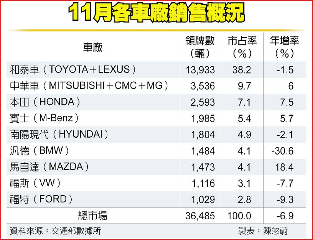 觀察11月各品牌表現,和泰車旗下雙品牌合計登錄1.39萬輛,市占率達38.2%,持續扮演車市定海神針關鍵角色;TOYOTA累計前11月市占率30.5%,為近12年同期新高,LEXUS前11月領牌更是豪華車品牌唯一正成長。