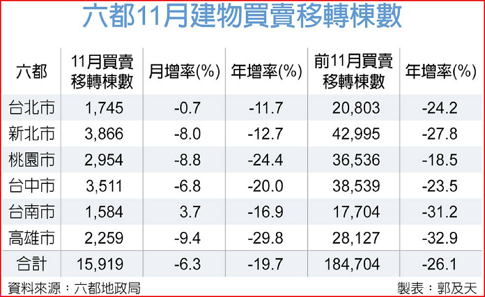 統計顯示,六都11月買賣移轉棟數除台南月增3.7%,其餘五都均較10月衰退;與去年同期相較,六都則各減少11.7%~29.8%,合計數年減19.7%。隨比較基期開始反應去年信用管利政策上路後的低量表現,近兩個月年減幅度開始收斂,反映市場交易量開始低檔築底,不過全年交易量不及26萬棟,可能寫下2017年以來的新低量。