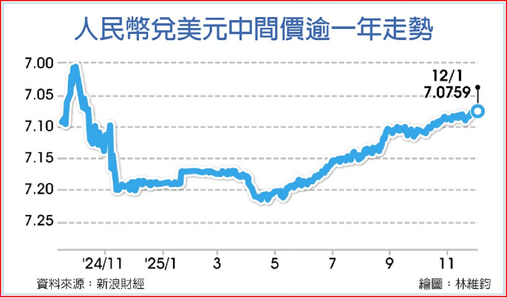 今年截至12月1日,中間價累計漲幅達1.59%,在岸價累計升幅更高達3.2%,漲勢驚人。