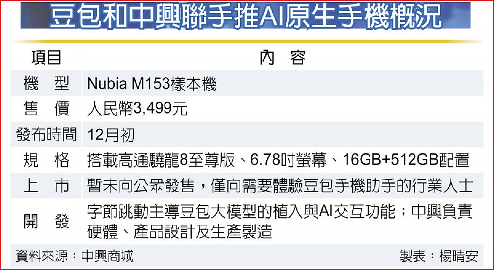 字節跳動與中興通訊於12月初聯手發布AI原生手機,由字節跳動主導旗下豆包AI大模型植入和交互功能,搭載於中興Nubia樣本機M153。最新AI手機將取代網站、應用程式入口,打通手機操作系統,首波預覽版售價人民幣(下同)3,499元,鎖定行業人士發售。