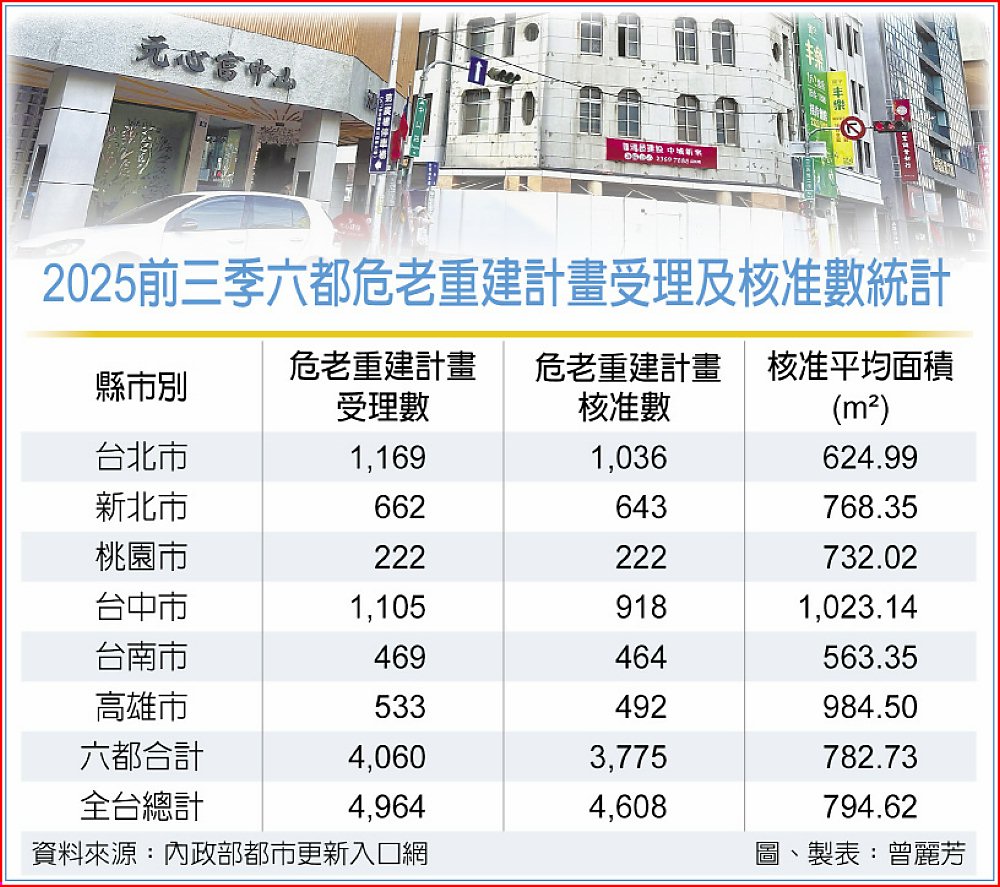 在危老重建計畫累計核准量方面,台中前三季已達918件,居全台六都第二,平均核准面積1,023平方公尺,更高居六都之冠。台中市成為全台規模最大的危老重建城市,顯示台中危老案不僅成長迅速,基地規模也更具開發效益。