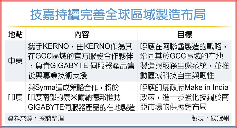 技嘉不斷擴展全球區域製造能力,日前也宣布委由杜拜在地硬體製造商KERNO Enterprises FZE,作為其在GCC(海灣阿拉伯國家合作委員會)區域的官方服務合作夥伴,由其全面負責技鋼的伺服器產品售後服務暨專業技術支援;此合作同時也呼應在阿聯酋製造的戰略,鞏固在地製造與服務生態系統。