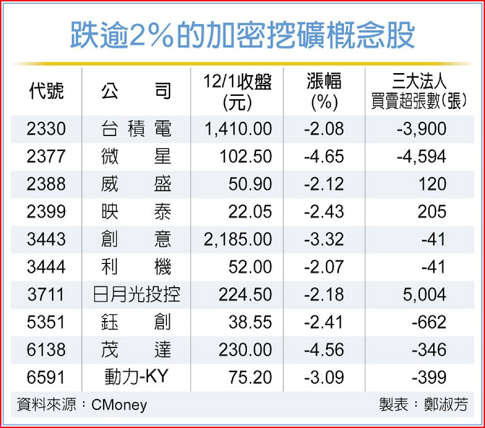 在未來跌勢仍在可控範圍內,昨日加密幣概念股表現還算淡定,相關個股跌幅均能嚴控在2%以內,跌幅逾2%的個股包括台積電、微星、威盛、映泰、創意、利機、日月光投控、鈺創、茂達、動力-KY共計十檔,其中主攻設計挖礦專用晶片的創意、威盛、茂達均入列,茂達跌幅更以4.56%居冠。