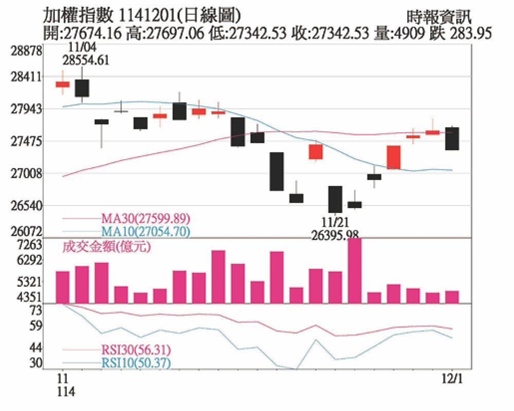 展望台股12月走勢,過去五年和十年台股12月上漲機率達8成,平均漲幅分別為2.65%和1.72%,加上11月指數修正2.15%,也拉大12月反彈空間。近期台股呈現價漲量縮走勢,上周重回月線及10日線之上,月線與年線修正乖離,加上技術指標MACD將進入負軸收斂,盤面由空轉多,短線翻多可以10日線、27,054點為觀察指標。