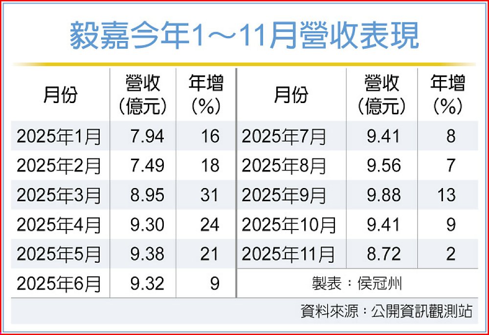 毅嘉(2402)1日公告11月營收,車用產品需求持續穩健帶動,11月營收達8.72億元,年增2%;今年前11個月累計營收99.37億元,年增14%。展望後市,毅嘉認為車用產品需求續強,第四季營收有望維持高檔;目前還在編列明年預算數,預期2026年第一季到第三季營運曲線與今年類似。