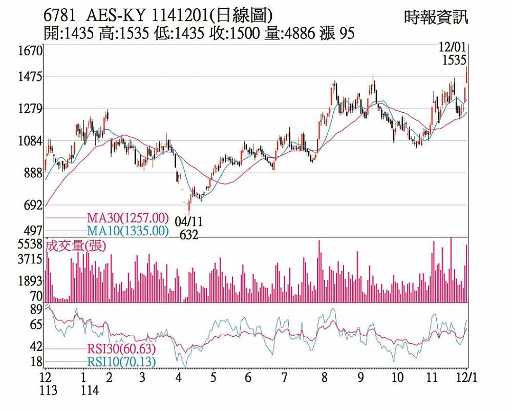 AES-KY(6781)1日不受大盤重挫影響,領軍BBU族群大漲。AES-KY 1日上漲6.76%作收,收盤價1,500元,衝上歷史新高,成交量放大至約4885張。