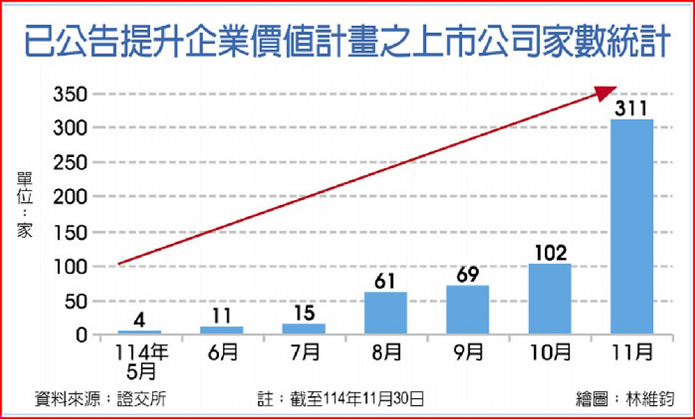臺灣證券交易所推動「Power UpTW提升企業價值計畫」獲得上市公司積極響應。證交所統計,截至11月30日止,共有311家上市公司響應並公告相關計畫,占上市公司總家數約29%,證交所不僅鼓勵上市公司提出計畫,更重視提升企業價值計畫內容品質,以遠東新、台達電、彰銀、安泰銀、玉山金、中信金、永豐金及遠傳等8家公司,所揭露之計畫架構較為完善。