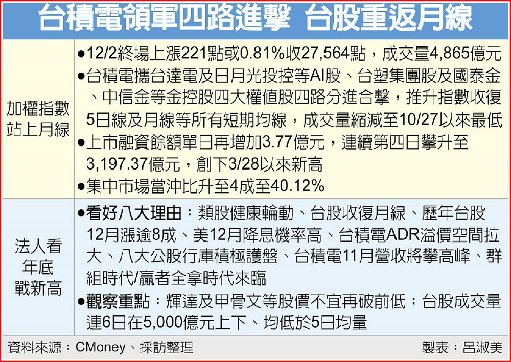 四、美12月降息板上釘釘,2026年續降息趨勢不變;五、台積電ADR溢價空間拉大;六、八大公股行庫券商積極護盤,今年來買超1,147億元,單11月來買超754億元、占比65%;七、台積電11月營收將攀高峰。