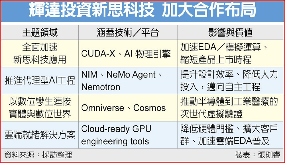 AI大廠輝達(NVIDIA)以20億美元入股新思科技(Synopsys),同步啟動跨越CUDA加速運算等多項深度合作。市場解讀,此舉已非單純策略聯盟,而是輝達提前在「3D IC時代」布下關鍵棋局。隨製程領先不再等同算力領先,台積電提出晶圓代工2.0,意味下一輪半導體主導權將從製造轉向生態系。業者表示,輝達此刻押注全球最大EDA廠,透露意欲掌控3D IC生態與規格制定權。