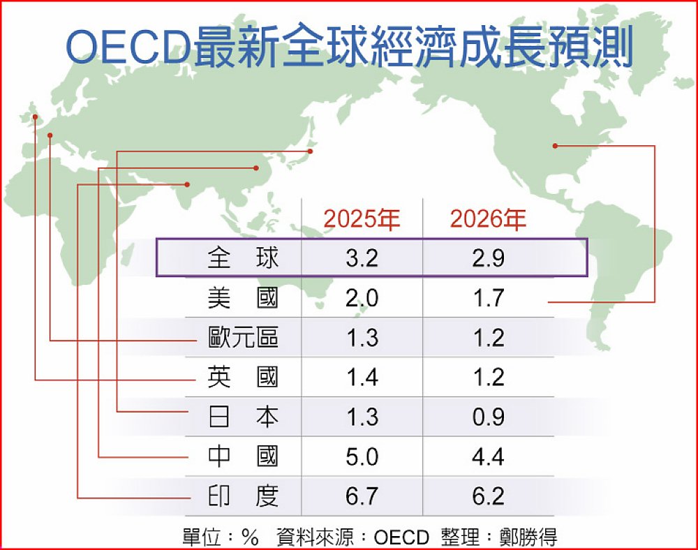 OECD 2日公布的《全球經濟展望》,維持今明年全球經濟成長預測不變,並預估2027年成長率升至3.1%。