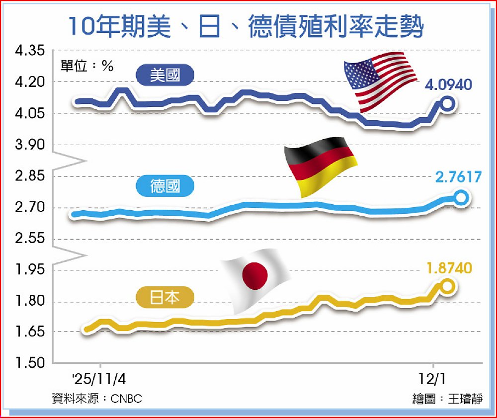 日本銀行(央行)總裁植田和男暗示12月將升息,加上市場押注聯準會(Fed)下周例會將再度降息,美日政策預期分化,推動日圓和日債殖利率走揚,恐將引發全球資金波動劇烈,分析師認為資金可能從美國股債流出,導致全球金融環境出現緊縮,流動性因而變差。