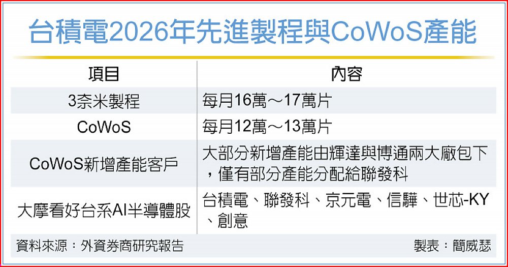 摩根士丹利證券半導體產業分析師詹家鴻早在11月中時,便基於終端需求強勁,接連調高台積電3奈米製程、CoWoS於2026年的產能預估,分別拉升至每月16萬~17萬片與12萬~13萬片,掀起外資調升產能估計序幕。