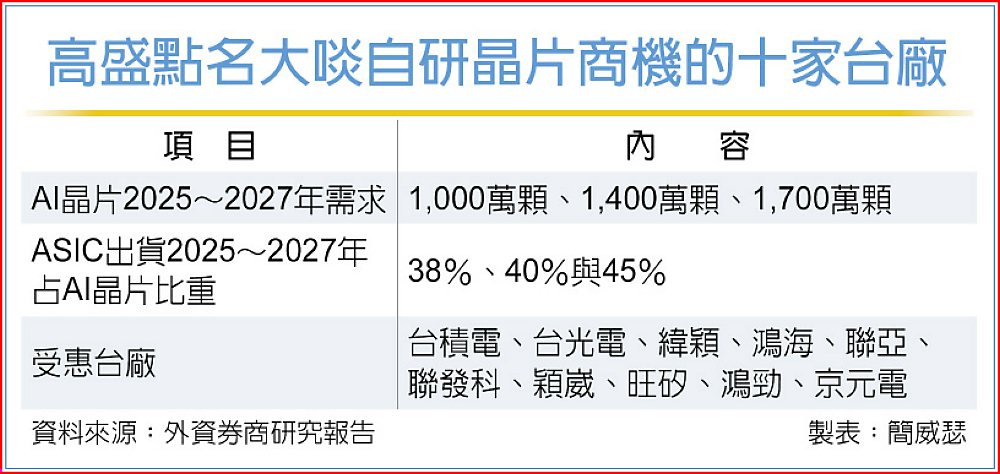 高盛證券看好受惠ASIC趨勢的台系供應鏈,包括台積電、台光電、緯穎、鴻海、聯亞、聯發科、穎崴、旺矽、鴻勁、京元電子等十大供應商;其中聯發科與京元電子投資評等為「中立」,其餘皆為「買進」。