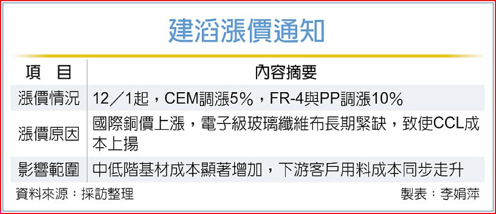 CCL(銅箔基板)產業再掀新一波漲價潮,繼台廠南亞於11月20日宣布,全系列CCL與PP產品一律調漲8%後,中國大陸覆銅板龍頭建滔積層板也在12月1日通知客戶,旗下CEM系列全面調漲5%,中高階FR-4與PP則上調10%,反映原物料成本快速墊高。