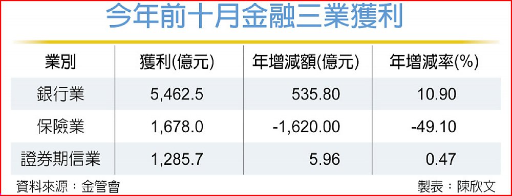 對銀行業於金融三業中表現持續領先的現象,金管會表示,獲利出色主要是因利息與手續費淨收益提升、呆帳費用降低,前十月銀行業整體獲利5,462.5億元,寫下歷年同期新高,比去年同期增加535.8億元。其中本國銀行獲利達5,070.8億元,同樣刷新同期紀錄,較去年同期增加490.4億元。