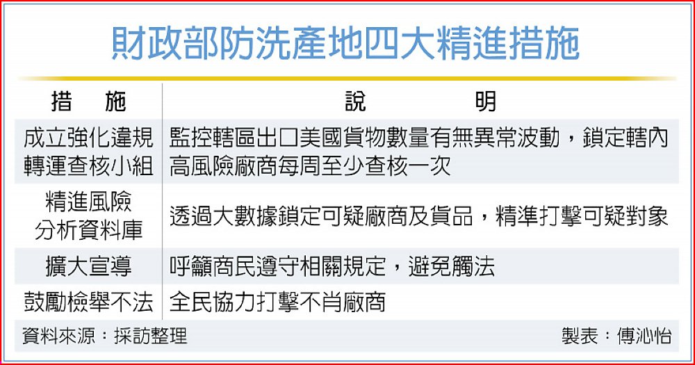 為防堵這類違規,除了海關全面加強查緝,今年4月財政部也成立「強化違規轉運查核小組」,針對進出口貨物產地標示加強抽核,嚴格查緝是否涉及違規轉運或偽標產地。