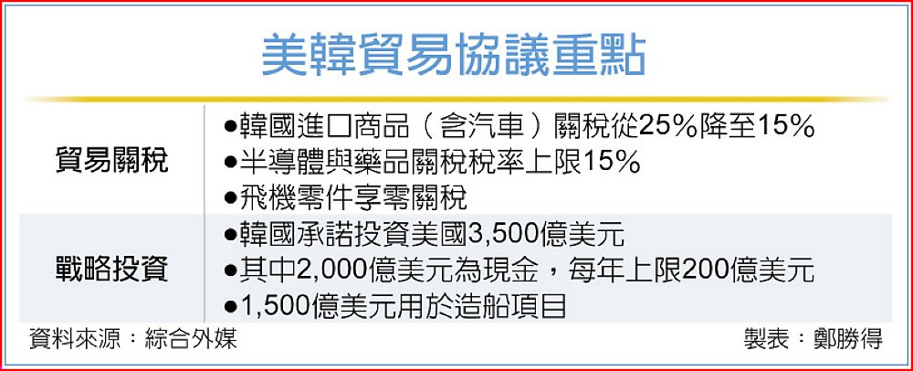 根據美韓協議,美國自韓國進口的汽車與汽車零件關稅降至15%。此外,美國未來因國安理由徵收的半導體與藥品關稅不得超過15%上限,令韓國與日本及台灣等主要對手得以處於公平起跑點。韓國則承諾投資3,500億美元協助美國發展戰略產業。韓國將以分期方式提供2,000億美元現金,每年上限200億美元,以避免造成韓元大幅波動。其餘1,500億美元將投入造船合作。
