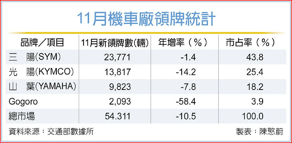 全球經濟環境不確定性續影響買氣未完全恢復,11月機車市場再度回到「年月雙減」低檔盤整格局。據統計,11月領牌僅5.43萬輛,不僅年減10.51%,更較10月衰退16%。