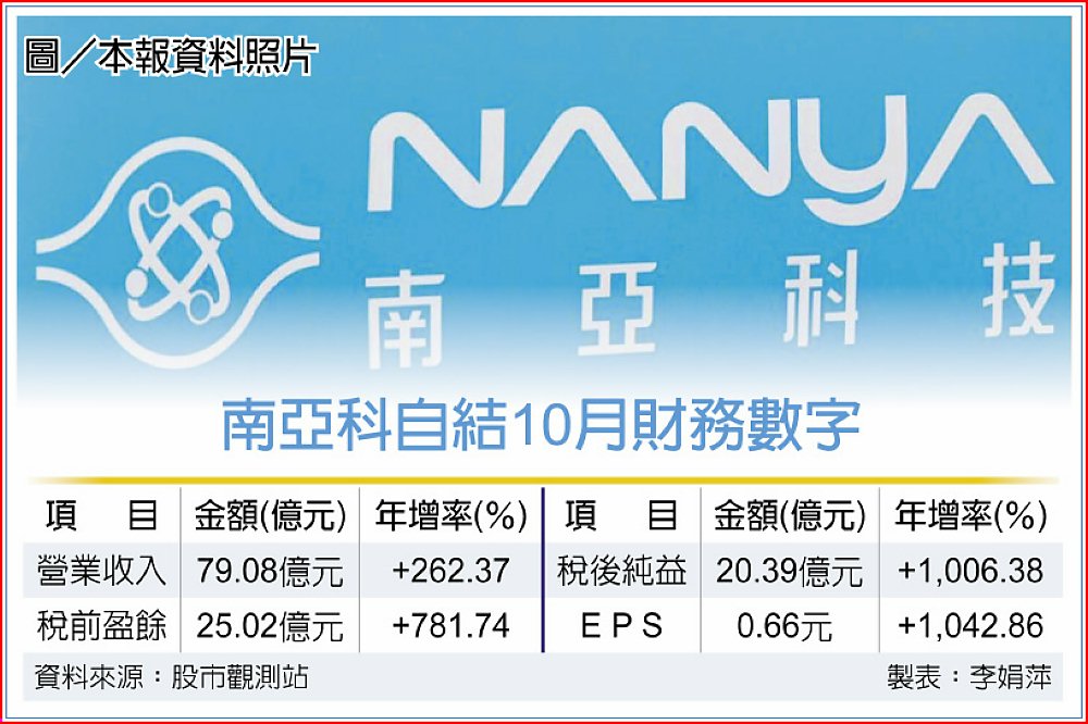 南亞科(2408)2日公告10月自結財報,稅後純益突破20億元、達20.39億元,年增1,006%,單月每股稅後純益(EPS)0.66元,超越第三季單季EPS的0.5元,反映DRAM報價全面走揚的成績。