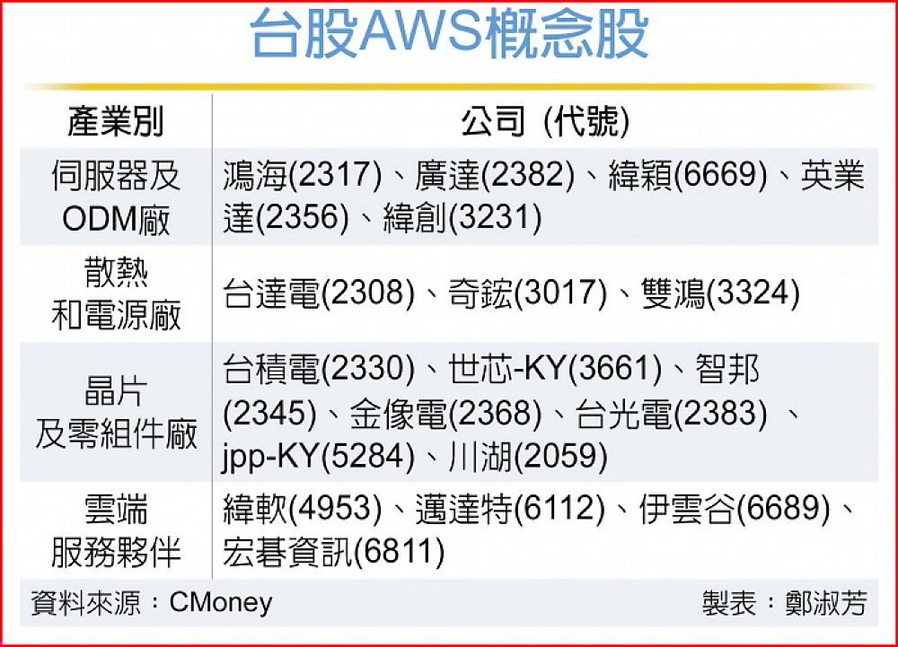 受到此利多帶動,台股的AWS概念股齊奮起,含鴻海、廣達、緯穎、英業達、緯創等伺服器及ODM廠,奇鋐、雙鴻、台達電等散熱與電源廠。另台積電、世芯-KY、智邦、金像電、台光電、川湖等零組件廠,甚或宏碁資訊、邁達特、緯軟、伊雲谷等雲端服務夥伴2日股價均有表態,不過受到加權指數開高走低影響,多數個股亦演出殺尾盤走勢,不過終場依然維持漲多於跌的榮景,其中尤以jpp-KY及世芯-KY漲幅最大,分別達到4.7%、3.95%。