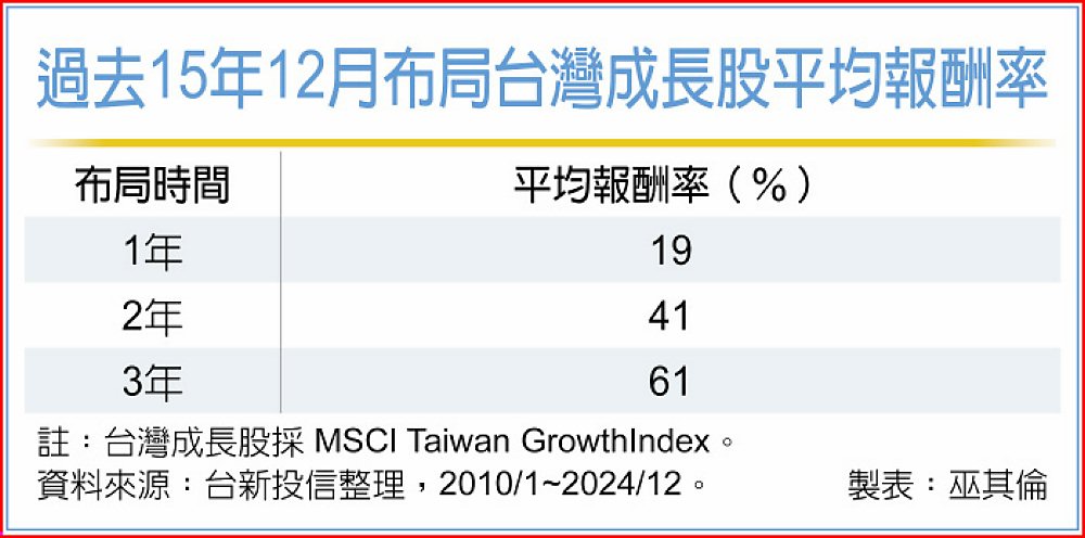 根據統計,過去15年每年12月進場買進台灣成長股(採MSCI Taiwan Growth Index),持有一至三年平均報酬率皆可達二位數。台新臺灣優勢成長主動式ETF基金(00987A)於12月3日開始募集,搶攻優勢成長股錢潮。