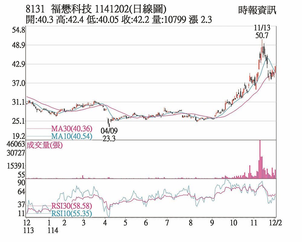 基本面方面,福懋科主要從事IC封裝與測試,屬於記憶體後段供應鏈,受惠AI伺服器、高速運算帶動DDR5與高速模組需求成長,封測產能利用率維持高檔。客戶涵蓋南亞科、威剛、晶豪科等記憶體廠,營運結構穩健。福懋科前十月營收78.63億元,年增4.96%,在AI推動記憶體需求增加下,動能可望延續。