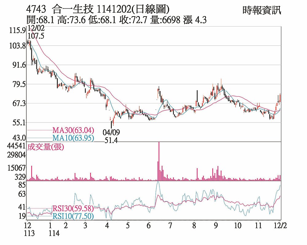 合一(4743)受惠旗下FB825應用於治療IgE介導的過敏性疾病的專利,取得韓國專利證書,激勵股價連漲多日,2日以72.7元作收,創下近二個多月新高,漲幅6.28%,成交量6617張。