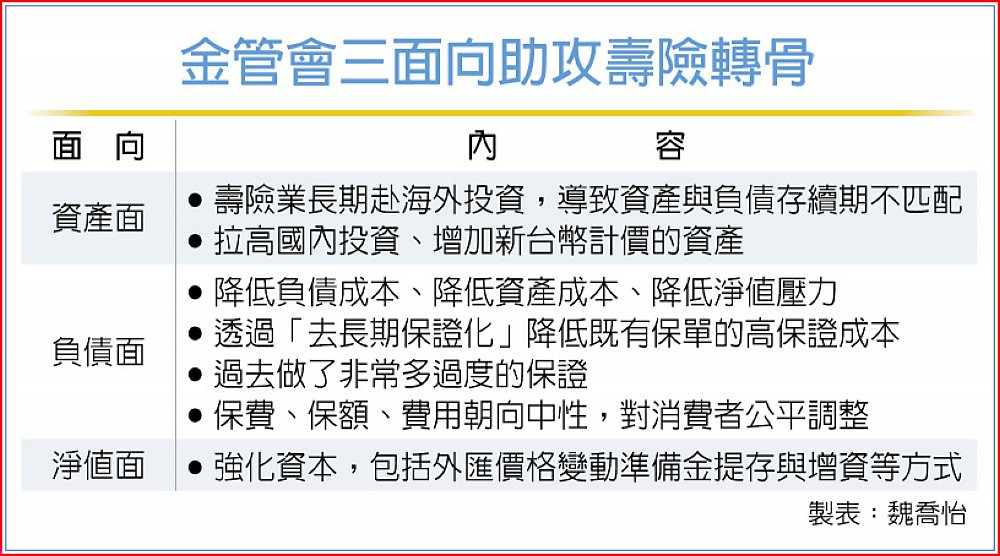 彭金隆3日在立院財委會表示,資產面就是把資產負債配置改變,壽險業長期赴海外投資,導致資產與負債的存續期不匹配,因此要扭轉這個情況,增加新台幣的投資、拉高國內投資比重;負債面是降低負債成本,降低資產成本,也會降低淨值壓力。尤其,透過「去長期保證化」,降低既有保單的高保證成本,避免再度將風險轉嫁給社會;淨值面是強化資本的措施,包括外匯價格變動準備金提存與增資等方式。