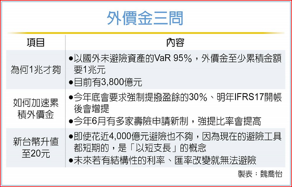 壽險業外匯價格變動準備金至少上兆元,才能達國外未避險資產的VaR 95%標準,多位立法院財政委員會立委3日對此表達關切。金管會主委彭金隆坦言,壽險每年花2,000億元避險,今年更花近4,000億元,但若新台幣對美元來到20比1的極端情境,也無法填補所有損失,所以要立刻調體質,「強制提撥外價金、增資」是重要的措施。