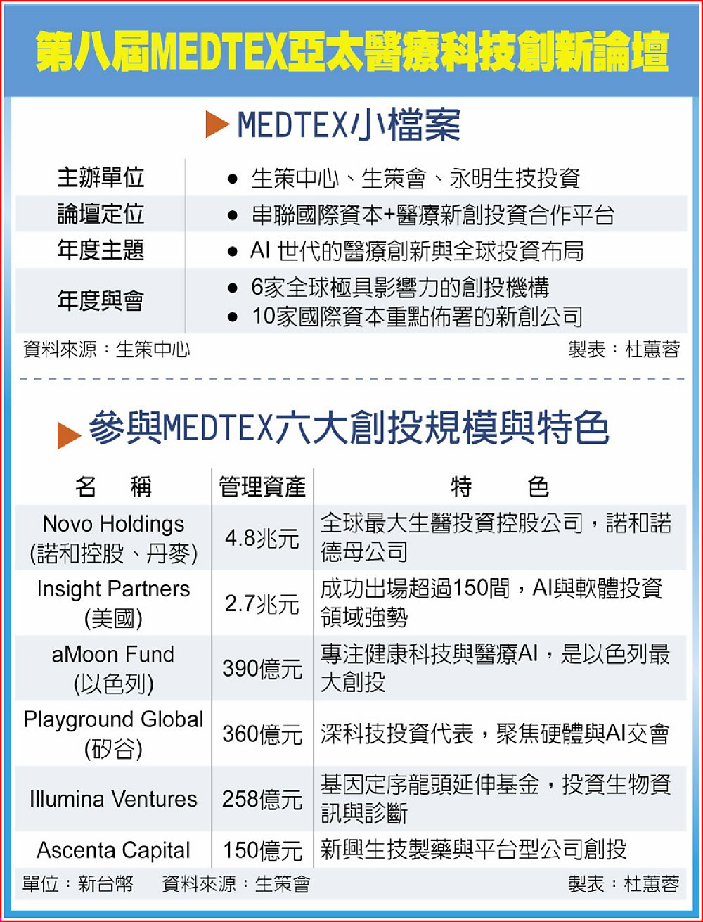 此次來台的六大創投Novo Holdings、Insight Partners、Illumina Ventures、aMoon Fund、Playground Global、Ascenta Capital,橫跨歐美及以色列,合計管理資產超過新台幣8兆元;另外,十家新創公司與國內生醫產業對接,聚焦AI新藥、合成生物學、分子膠與細胞治療等國際資本最積極布局的領域。