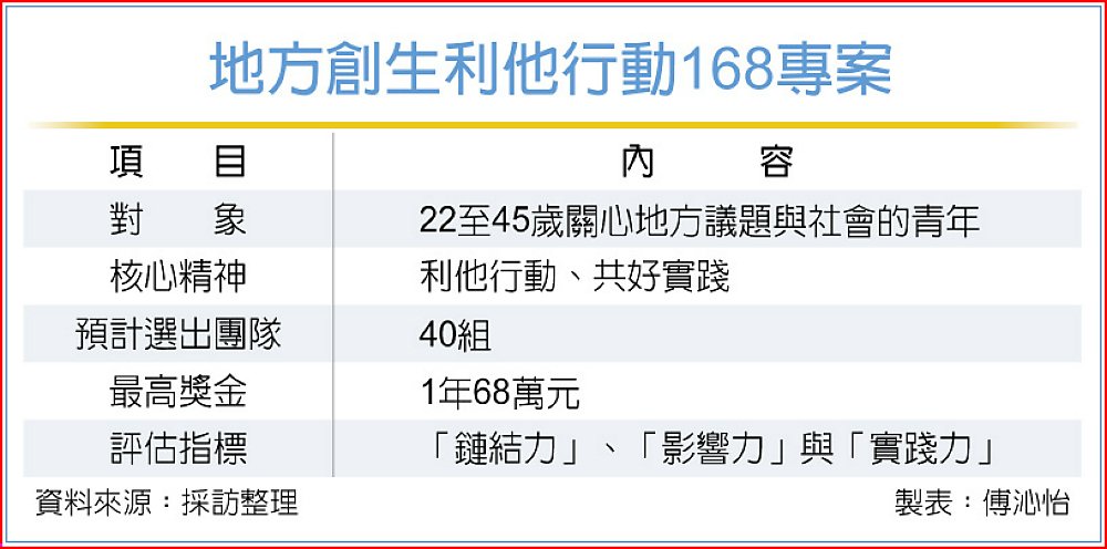 為深化推動地方創生共好利他精神,國發會啟動「地方創生利他行動168」專案,鼓勵青年提出並實踐地方倡議行動。國發會3日表示,全台共24個創生廊道,實踐可落地、可擴散的創生行動。申請時間自即日至明年1月5日,預計在全台選出40組青年團隊。