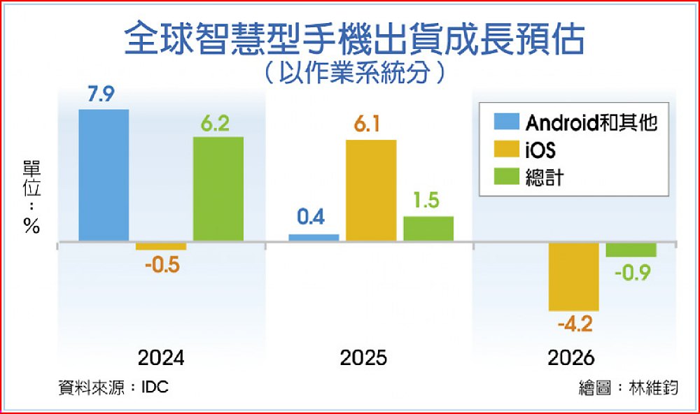 市調機構IDC表示,受累於零件短缺和產品週期調整等因素,明年手機出貨增幅預測值從1.2%下修至0.9%,加上iPhone發布時間從2026年秋延到2027年初,估計明年iPhone出貨減少4.2%。