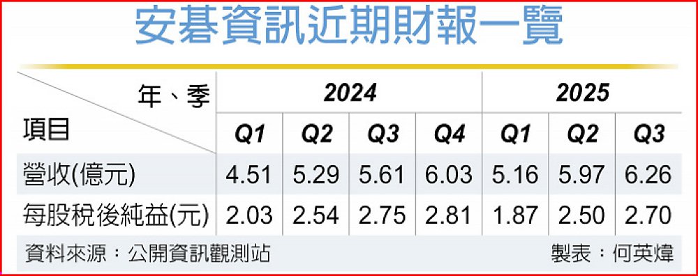 安碁資訊前三季稅後純益2.12億元,較前一年度大幅成長31.67%,因2024年增資,今年前三季每股稅後純益為7.07元,略低於去年同期的7.32元。整體而言,第四季的旺季效應下,全年營收可望創新高,獲利的絕對值亦會新高。