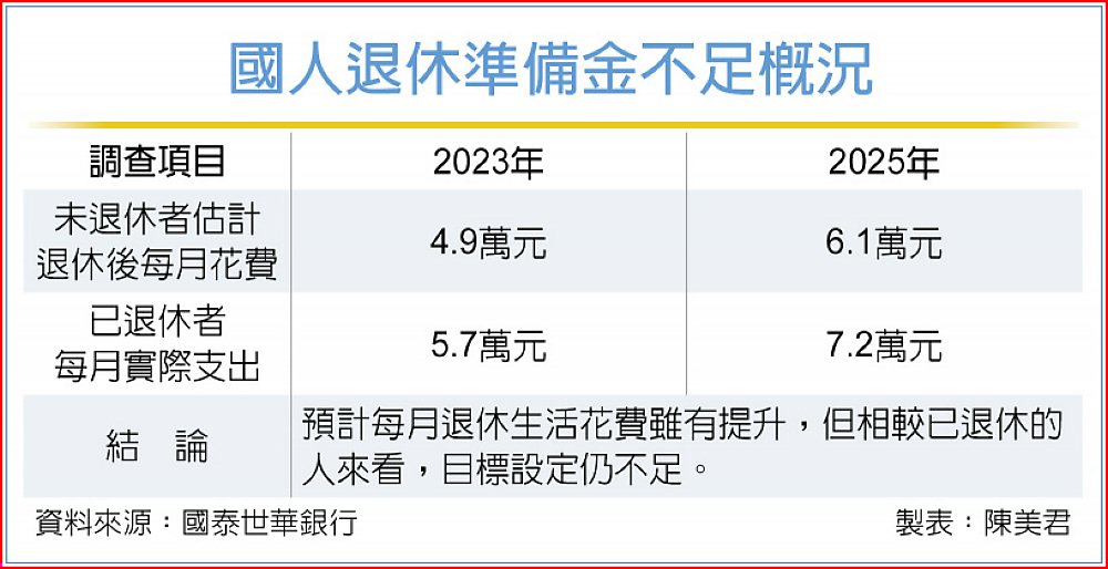 國人退休金準備嚴重不足。國泰世華銀行攜手資誠企業管理顧問公司4日發布「2025臺灣全民財務健康關鍵報告」,結果顯示,民眾預估退休後每月所需生活費,自2023年的4.9萬元攀升至今年的6.1萬元,但與已退休者每月平均實際支出7.2萬元相較,仍有明顯落差。