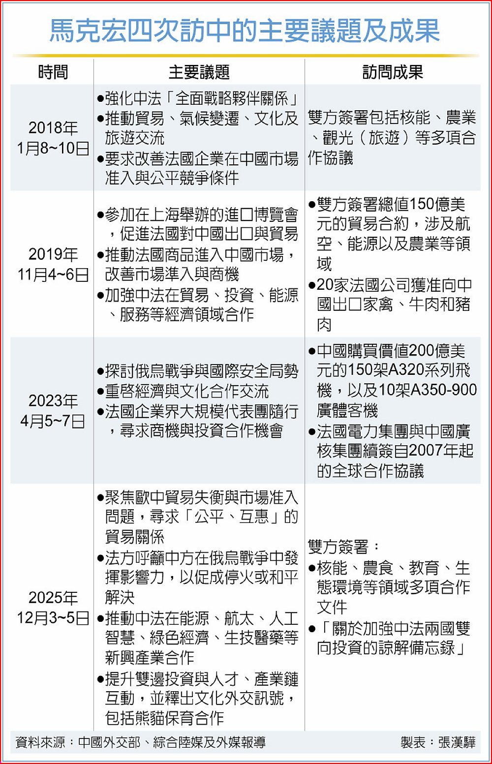 馬克宏則提出三大合作方向,包括地緣政治穩定、雙邊經貿再平衡與環境永續,並強調在俄烏戰爭上「中法合作的能力至關重要」。