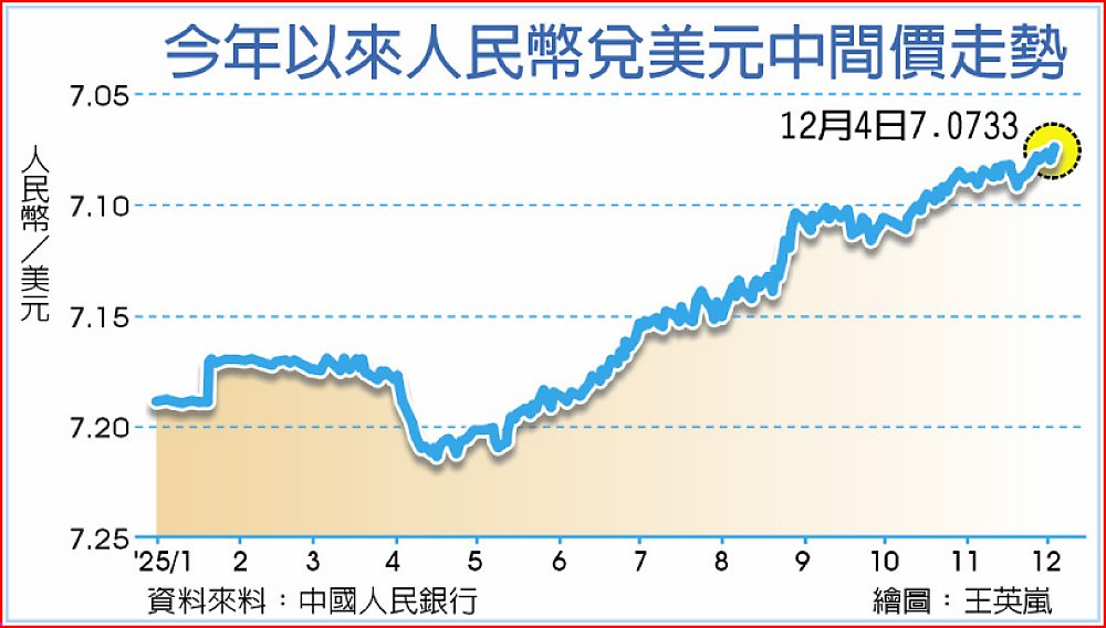 綜合陸媒報導,美元近日在多重利空消息下維持疲軟,人行4日順勢將中間價上調21個基本點、報7.0733元,再創2024年10月14日以來新高。此舉帶動即期匯價早盤走揚,人民幣兌美元離岸價一度升至7.0542元的逾一年高點。不過午盤後轉跌,在岸官價收報7.0690元,跌29個基本點,夜盤時刻更跌至7.07元區間,離岸價截至晚間7點則在7.0663元附近震盪。市場普遍認為,人民幣短線仍有走強空間,有望挑戰整數7元大關。