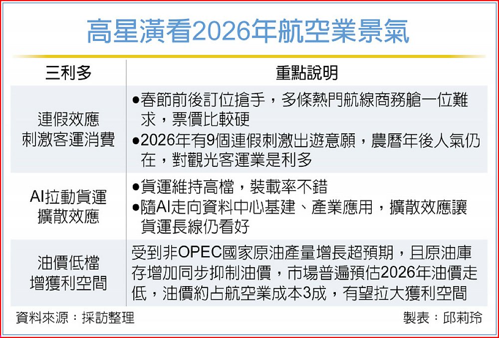航空業擁三利多,包括連假效應刺激客運、AI拉動擴散效應、油價低檔增裕獲利空間,華航董事長高星潢4日表示,樂觀看待2026年客貨運。他感謝政府補假不補班新政,2026年將有多達九個連假,刺激國人出遊意願,對觀光客運業是利多。