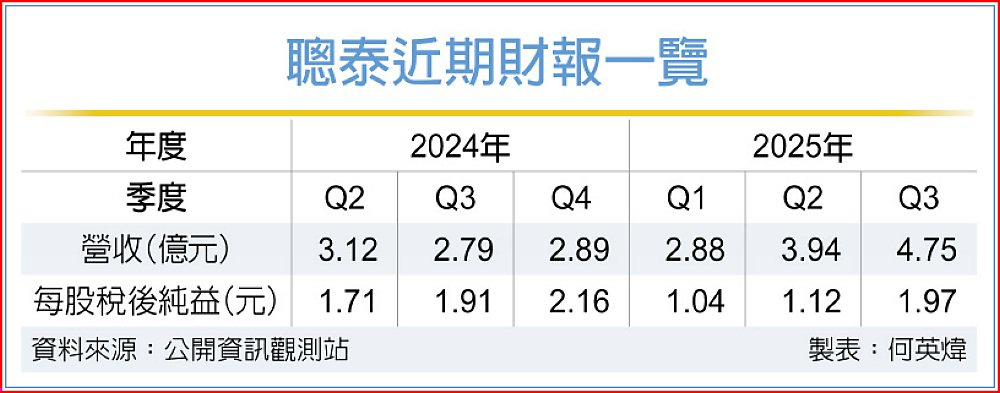 聰泰前十月營收12.64億元,年增26.09%,前三季每股稅後純益4.13元。該公司表示,今年業績維持雙位數成長,2026年成長動能亦明確。