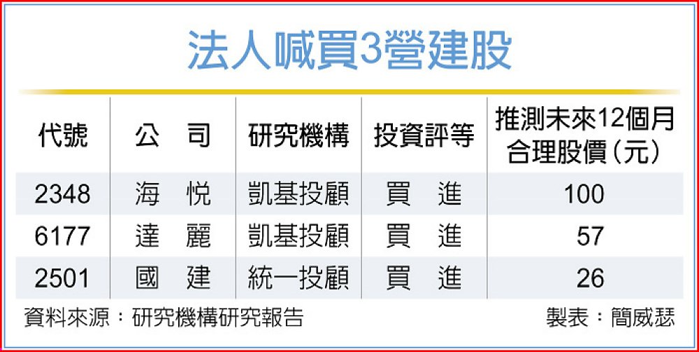 AI旋風持續席捲台股,非科技股獲得資金關愛度雖低,法人研究機構卻看到長線資金的投資機會。凱基投顧指出,房市成交量築底訊號浮現,看好房市成交量已落底,並將緩步回升,給予海悅(2348)、達麗(6177)「買進」投資評等;統一投顧則升評國建(2501)至「買進」,盛讚其為穩健優質存股標的。